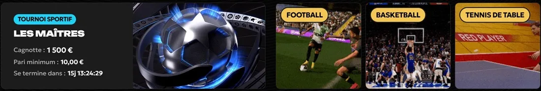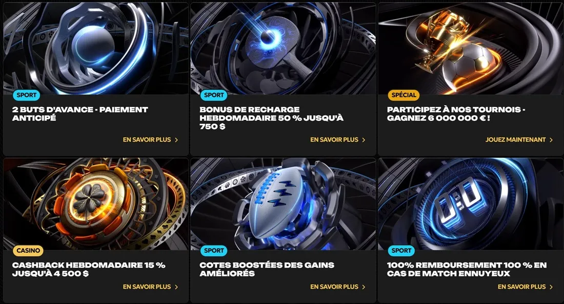 - la promotion â2 buts dâavanceâ, sans exigence de mise, qui permet de toucher sa mise avant la fin dâune rencontre sportive (Early Payout), pour tout match prĂ©sentant un diffĂ©rentiel de deux buts entre deux Ă©quipes;