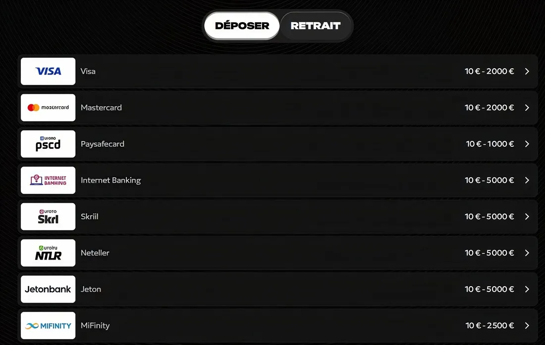 Examinons tout dâabord les mĂ©thodes de dĂ©pĂŽt acceptĂ©es par la plateforme. Elles sont les suivantes :