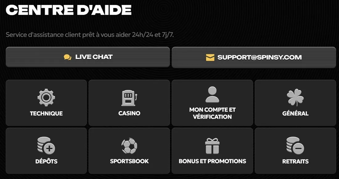 Terminons cet avis par un bref examen des voies de contact du casino Spinsy. Lâassistance du casino en ligne est joignable de plusieurs façons, accessibles depuis lâonglet Centre dâAide (en bas du menu latĂ©ral gauche).